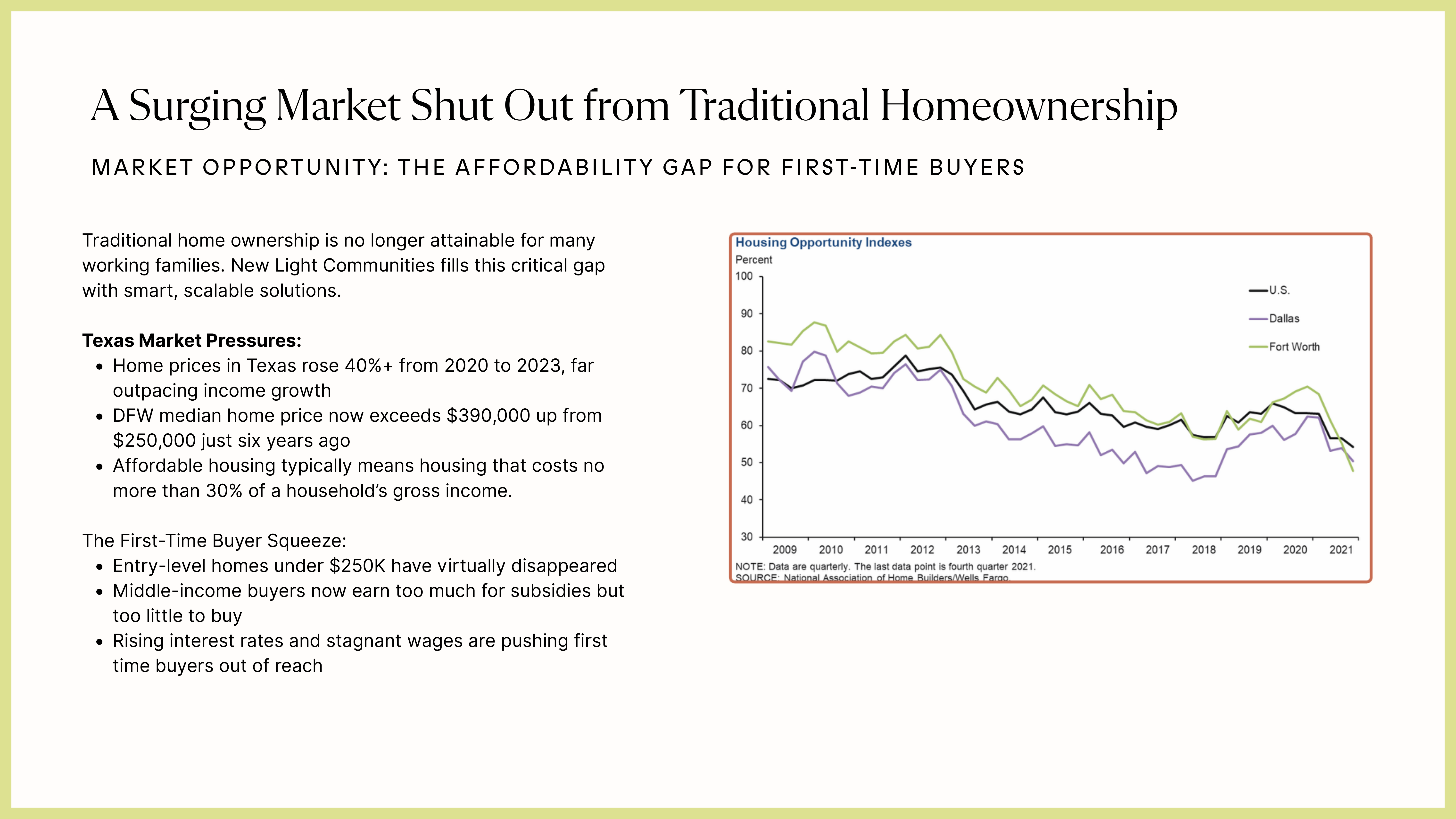 "In Texas's fastest-growing corridor, middle-income families are priced out of ownership. New Light Homes lets them see home in a whole new light — attainable, modern, and within reach."
