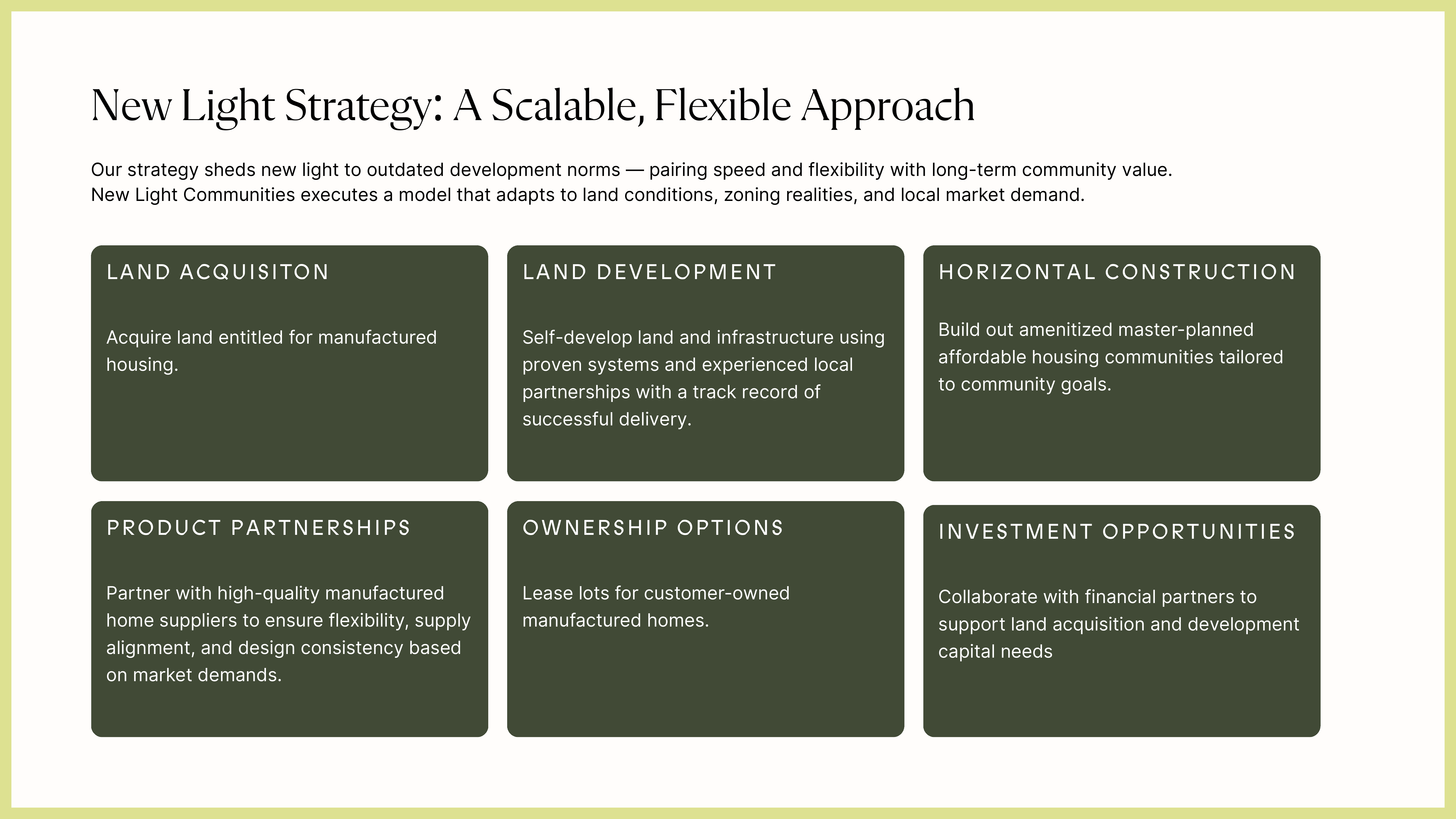 Our strategy sheds new light on outdated development norms \u2014 pairing speed and flexibility with long-term community value. New Light Communities executes a model that adapts to land conditions, zoning realities, and local market demand.